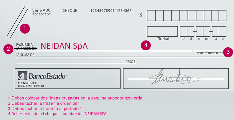El cheque debe extenderse a nombre de: NEIDAN SpA
